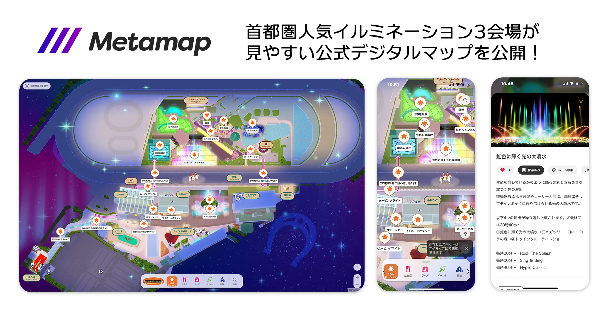 いよいよイルミネーションの季節が到来!ボールドライト株式会社(本社:東京都新宿区、代表取締役社長:宮本章弘)は、首都圏の人気イルミネーションを開催する各主催者が、心ときめく光の世界をより一層楽しんでいただくため、施設ナビゲーション・プラットフォーム「メタマップ」やデジタルマップ・プラットフォーム「プラチナマップ」を活用して、各会場公式デジタルマップを作成し、2025年10月より順次公開することをお知らせします。 「大井競馬場 東京メガイルミ」「よみうりランド ジュエルミネーション」「THE YOKOHAMA ILLUMINATION」の各会場で、スマートフォン一つで誰もが快適に楽しめる、新しい鑑賞体験が始まりました。